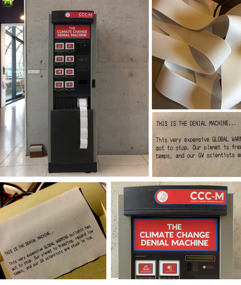 Interactive vending machine that dispenses rhetorical quotes from well-known and famous climate change deniers