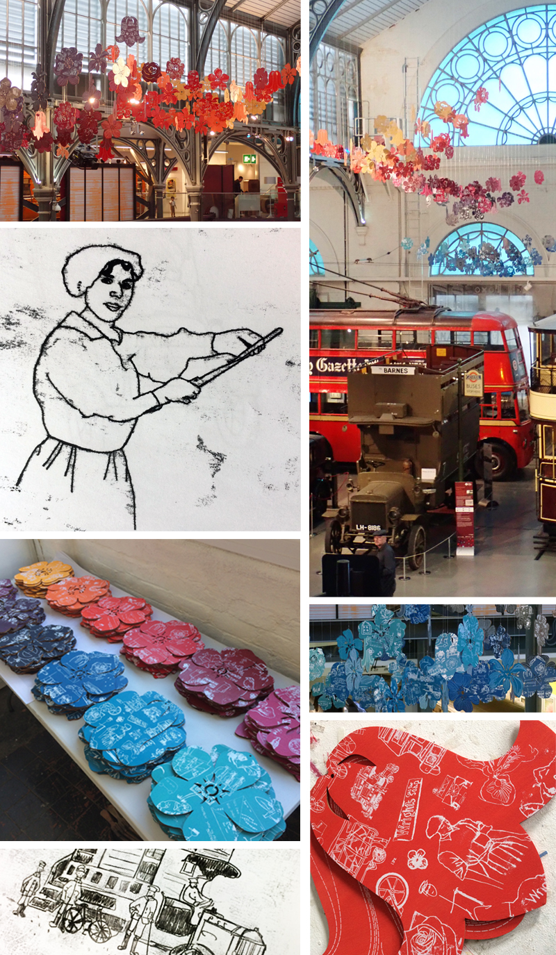 Forget Me Not Suspended installation of laser-cut flowers screenprinted with drawings and illustrations about the First World War's Battle Buses