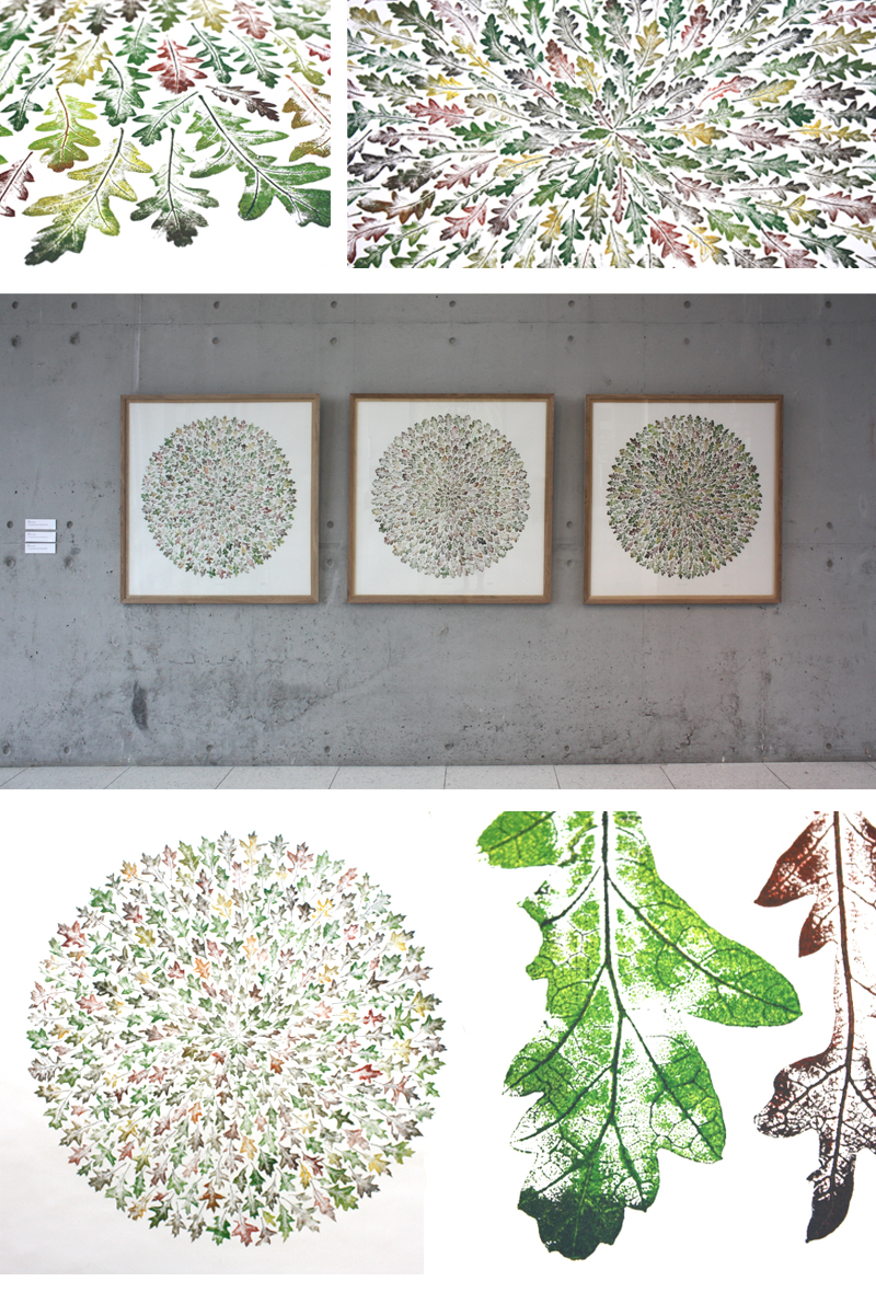 Triptych of oak leaf monoprints (each 1.2m x 1.2m)